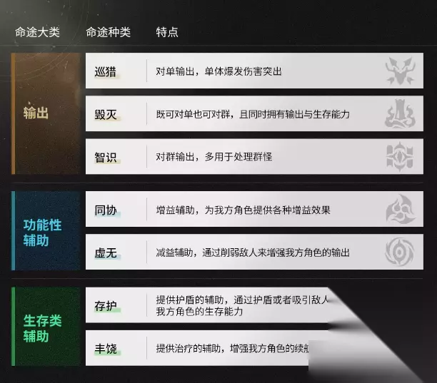 这里根据命途的特点将所有角色大致分为了三大类,分别是输出类角色、功能性辅助角色和生存类辅助角色。 其中输出类角色具有较高的输出能力,通常在队伍中负责爆发输出。功能性辅助角色通过给我方施加增益效果或者给敌人施加减益效果来提高我方输出角色的伤害。生存类辅助角色则是通过提供护盾或者回血的方式来增强我方角色的生存能力。队伍里一般需要这三类角色互相搭配才能打出更高的伤害。 当然了,输出类命途又可以细分为巡猎、毁灭和智识,每种命途拥有各自的侧重点,分别用于处理不同的情况,详情请参考上方表格,这里就不展开说明了。功能性辅助命途和生存类辅助命途也是同理。 二、基础队伍组建 ok,简单了解了角色的命途之后,咱们就正式进入队伍的组建。
