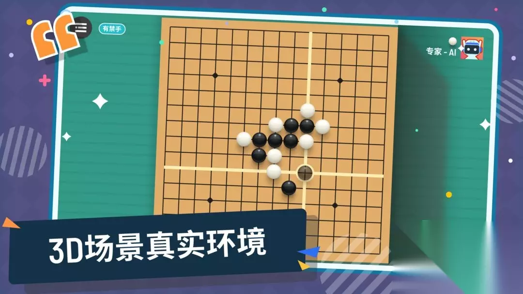 1、五子棋3D版简要评析: 全球无数人喜爱的棋盘游戏。在精心制作的棋室中体验宁静和禅意的对局。 ◇ 次世代五子棋,纯3D场景。 ◇ 无广告、无内购、完全免费。 ◇ 清新治愈的美术、轻松娱乐的音乐 ◇ 界面简洁、上手简单。 ◇ 线上匹配、挑战AI、本机双人对弈 ◇ 支持禁手规则 2、五子棋3D版图片欣赏: