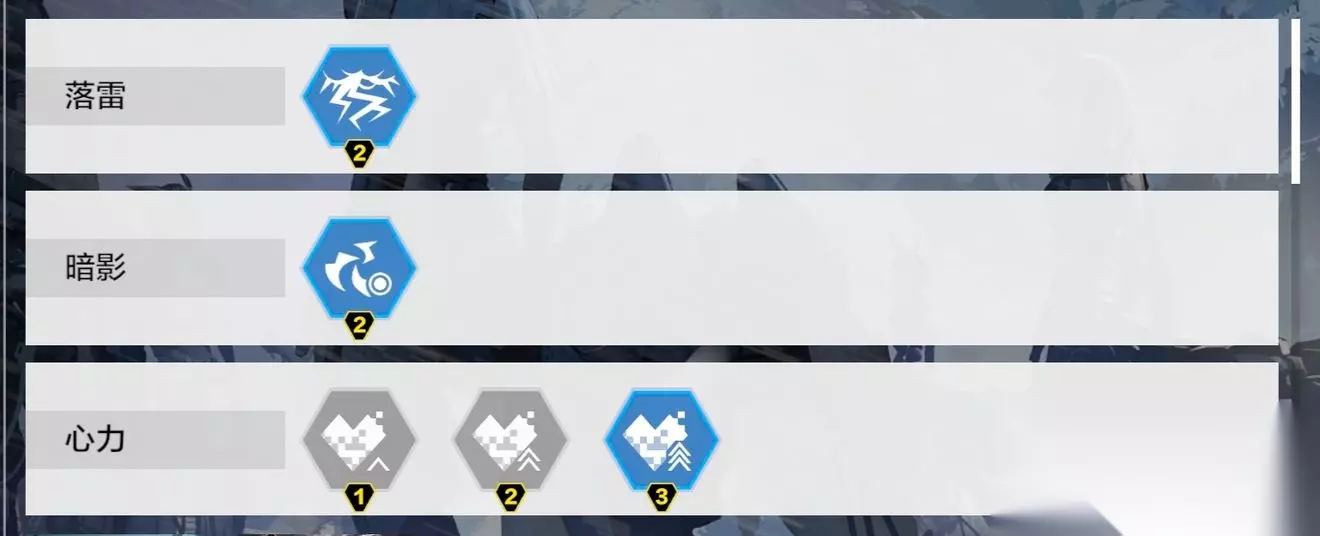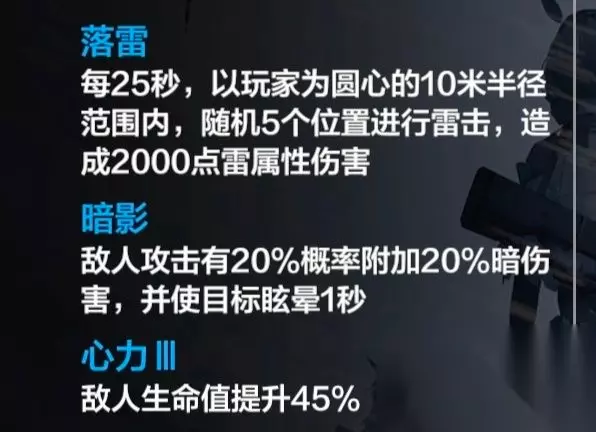 词缀分别有(落雷、暗影、心力、贯穿、嗜血、劣化、埋雷、暴走、强袭):