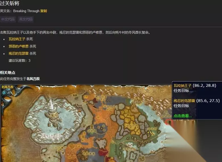 《魔兽世界怀旧服》wlk过关斩将瓦拉纳王子在哪 wlk过关斩将任务,需要杀死瓦拉纳王子(86.2,28.8)。 在北风苔原东北角的圣城恩其拉,玩家进入最底层站在祭坛上传送到浮空城后可以找到瓦拉纳王子以及手下的两名中尉,杀死后返回牦牛村完成任务。