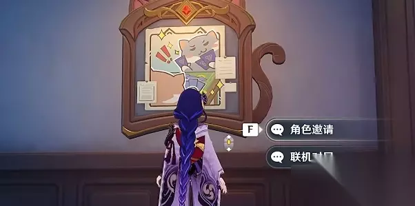2、来到猫尾酒馆以后,我们在旁边墙壁上可以看到一幅挂画,也就是角色邀约的入口处,我们可以触发联机对局模式。