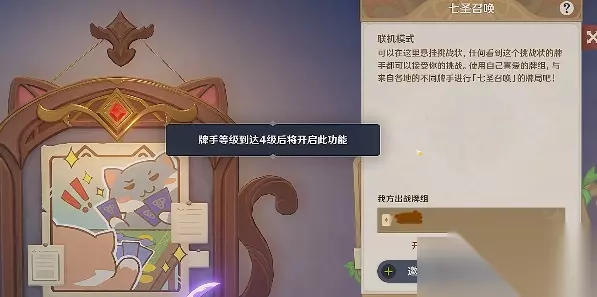 3、随机匹配:玩家需要通过七圣召唤对局,将自己的牌手等级升到4级以后才能进行联机匹配。