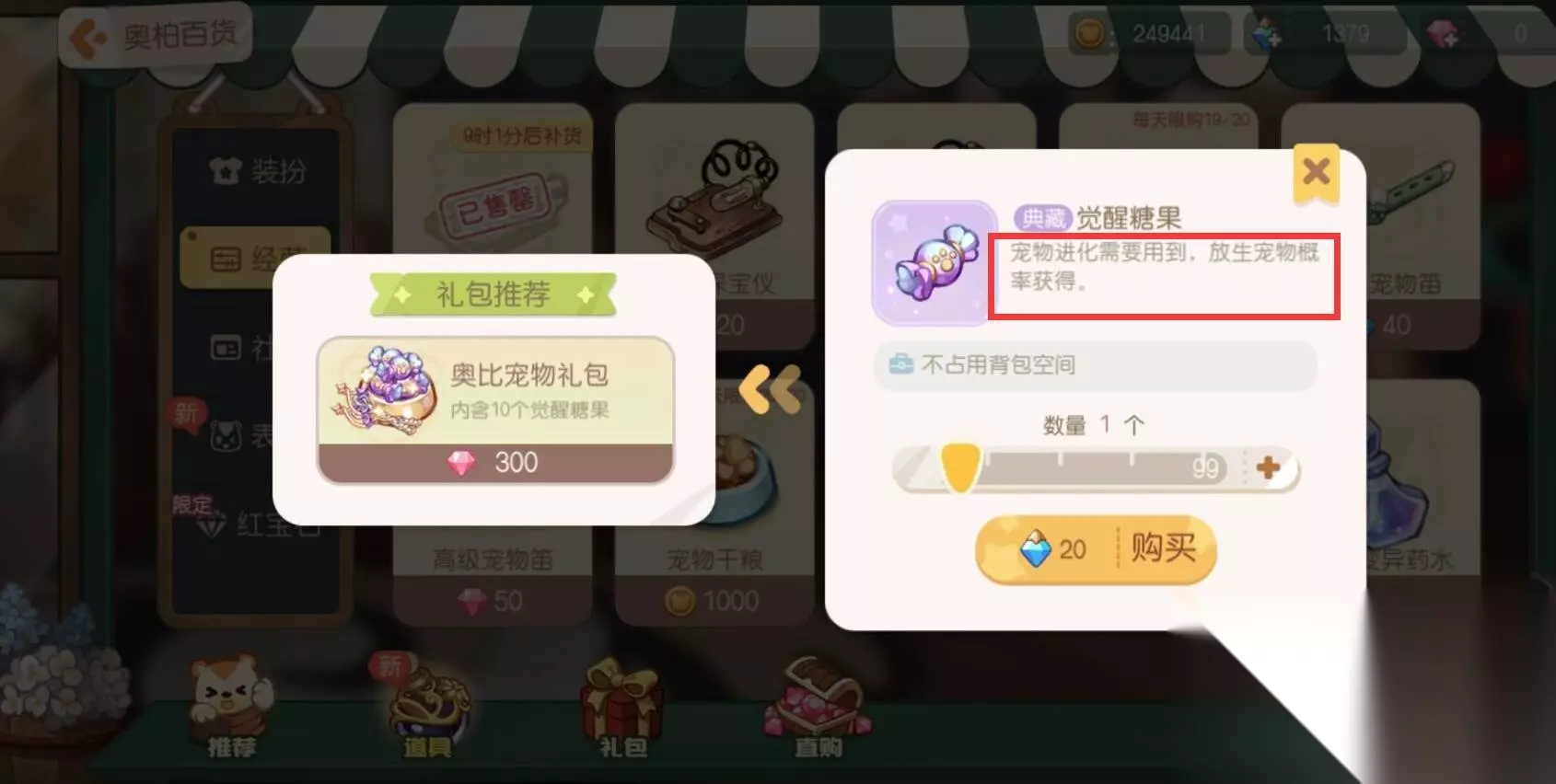 奥比岛手游觉醒糖果获得途径 觉醒糖果获取方法有两种,第一种的通过奥柏百货购买,需要花费20晶钻购买觉醒糖果。