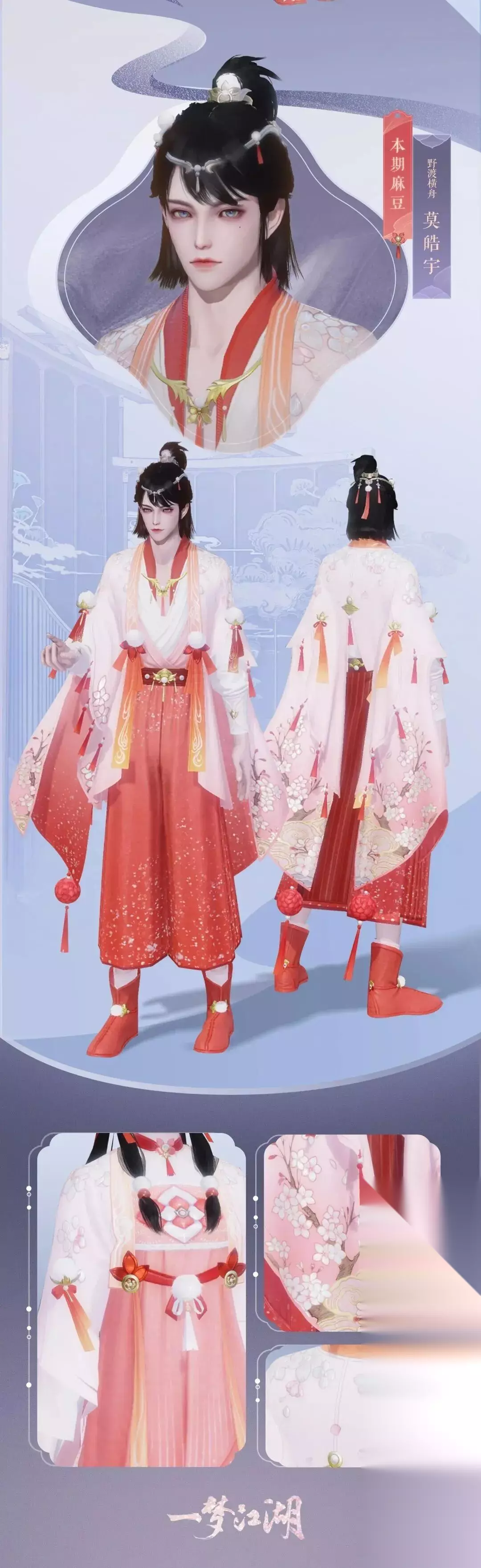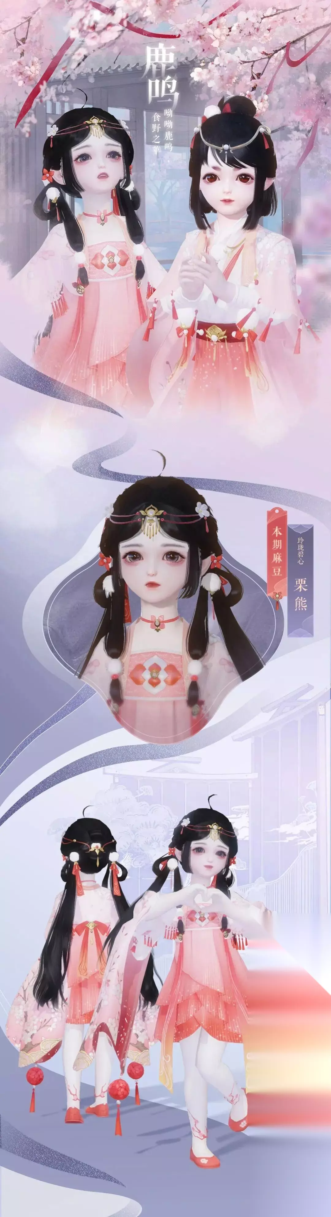 时装·鹿鸣少女体型是由时装设计大赛中 乔木木子 少侠设计而成,云锦楼弟子在此基础上补全了其他体型的时装。鹿鸣采用香叶红为主色调,鲜艳的色彩中点缀着朵朵桃花,精致可爱!而袖摆尾端随风摆动的俏皮桔红刺绣球,仿佛小鹿般调皮地撞进少侠们的心扉~ 女少侠着浅粉色的披肩外套,点缀得恰到好处的流苏增添活泼之感;足部蜿蜒而上的桃花枝设计,仿佛吸收了天地福泽一般,尽显钟灵隽秀!男少侠的可爱与灵动尽在细节处,发间的绒毛小球,后腰的渐变蝴蝶结,层次感十足的小小短靴! 女款时装梳着双马尾,戴流苏发饰,鹿角形状的项链,灵动又俏皮;渐变的宽大袖子点缀流苏与桃花刺绣,是这个冬天里最明媚的人儿!男款剪裁流畅大方,红色绒球点缀全身,仿佛是冰天雪地间的一头小鹿,集自然生气,伴风踏雪而来!