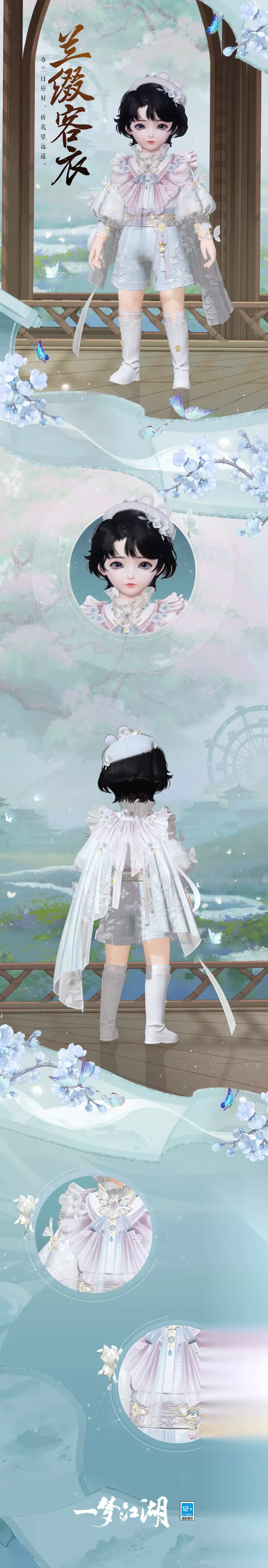 时装·兰缀客衣色调淡雅清幽,清浅的粉色、柔柔的蓝色,用轻纱材质象征兰的温润。融入兰花元素,在领口、袖口、衣袂处点缀优雅花边与纯白编绳,风拂过,如同蝶翼翩翩起舞。 男款时装潇洒轻盈的时装·兰缀客衣,衣袍之间细绣洁白兰花图案。飘逸丝带于身后轻垂,独具浪漫色彩。女款时装优雅纯粹,镶珠兰花在鬓间散发着莹润光泽,蝶翼扑朔停留腰间,勾勒出婀娜腰身,搭配成套珍珠戒指与手链,更显优雅端庄。
