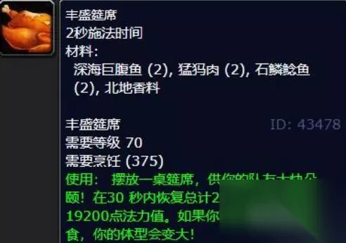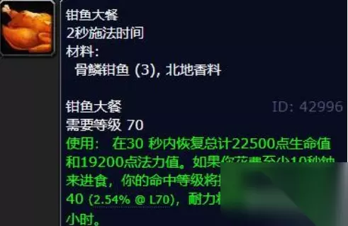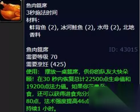 魔兽世界鱼类烹饪食谱有什么 鱼类烹饪食谱介绍: 1、鱼肉筵席,需要用到蚌背鱼、冰河鲑鱼、水母。
