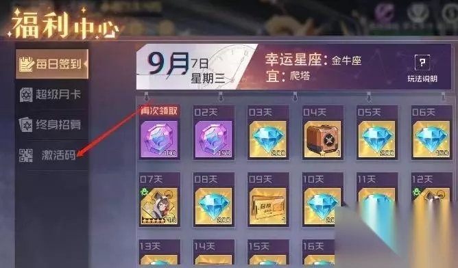 2、进入福利中心后点击左下角的激活码进入到兑换中心界面