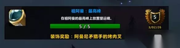 解锁条件:无前置任务,任何等级均可做。 奖励:成就点数+阿曼尼矛猎手的烤肉叉(家宅装饰)。 进度:账号共享,一个角色激活全账号生效。