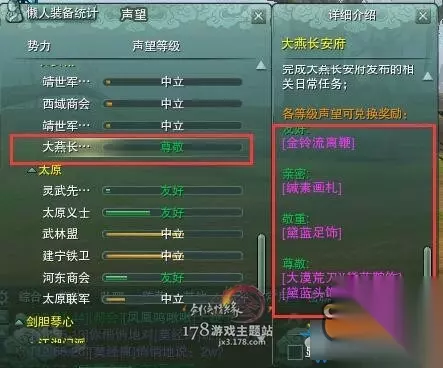 剑网3里有很多马具,成就所得,任务所得,还有声望兑换所得,声望兑换的马具有哪些呢?和小编一起来看看剑网3声望马具整理吧! 首先介绍大燕长安府的声望马具,加速比商城的还要高速度提升6%,商城马具提升4%,目前业界最快的马具,不嫌丑的话还是非常值得购买的。每个等级都能换相应的马具。 注意:大燕长安府的声望在长安城,如做任务升级必须将长安城靖世军.义和靖世军.忠达到友好后才能开启大燕长安府的声望任务,用遗失的尊敬增加长安府声望的可以直接去长安东市购买。 其中金铃流离鞭这个挂件可以提升1%的速度,不想要马具的可以换一下这个。 一套换下来大概三万金左右,还是有点小贵的。