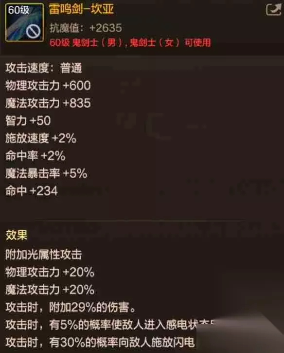 “雷鸣剑-坎亚”属性及强度分析 装备概述 “雷鸣剑-坎亚”为60级史诗短剑,男、女鬼剑士均可装备。 获取途径:剧情关卡、祥瑞溪谷、西部深渊 地下城模式属性 基础属性:抗魔值+2635,物理攻击力+600,魔法攻击力+835,智力+50,施放速度+2%,命中率+2%,魔法暴击率+5%,命中+234。 特殊效果: 附加光属性攻击 物理攻击力+20% 魔法攻击力+20% 攻击附加29%伤害 5%概率使敌人感电(持续5秒) 30%概率释放闪电(冷却时间5秒)