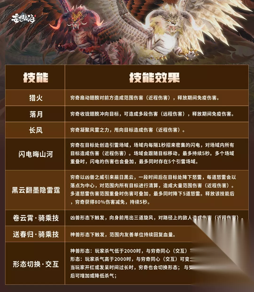 1、既然说到穷奇本体,就不得不提一下进化穷奇的配方了: ·千年进化配方:彘本体+颙鸟翅膀+褐金·闾糜尾巴+千年穷奇进化丹=千年·穷奇 ·五万年进化配方①:彘本体+颙鸟翅膀+莲白·闾糜尾巴+五万年穷奇进化丹=五万年·穷奇 ·五万年进化配方②:於菟本体+赤翎雕翅膀+褐金·闾糜尾巴+五万年穷奇进化丹=五万年·穷奇 没错,本次登场的穷奇拥有五万年资质,而且为了充分满足不同旅者的需求,本次的五万年穷奇拥有两种进化路线,旅者可以自由选择合适的方向。 2、五万年穷奇进化丹仅支持商城勾玉购买,原价7980勾玉,1月6日-1月29日期间盛惠68折;千年进化丹则可以选择商店购买或自行合成,商城购买和之前同价,活动期间享七折特惠。 ·千年穷奇进化丹=彘坎鬃*20+千年兽魂*8+太阳铭文*8+磐爪甲*8(磐爪甲可以通过击杀东岛新异兽四万年·从从、万年·从从获得) 3、与其同时,伴随着首只五万年进化宠穷奇登场的则是全宠物再蜕变的新时代的到来——骑宠进化再开放,全宠五万年时代来临!1月6日版本更新后,神兽可以再次蜕变至三甲级,其他的骑宠则都可以蜕变至五万年双甲级,蜕变方式与此前蜕变至三万年的方式相同,通过吞蛋集齐指定印记后,再服用新蜕变丹(元虚丹),即可实现蜕变,让宠物的实力再上一个大台阶! 4、而作为游戏内的首只五万年进化宠,穷奇的实力可不一般。 5、不过,需要提醒旅者的是,千年穷奇与五万年穷奇在外形、交互、技能等方面均有差别,千年穷奇后续需要通过服炼宠物元胎汲取各类精华,再服用指定蜕变丹完成年份进阶,才能解锁全部设定,包括神魔双形态也需要在成功进化至五万年后才可解锁。(注:蜕变难度受宠物类型和宠物当前所处年份影响,请旅者谨慎选择进化或蜕变路线。) 6、为了帮助旅者们更好的了解穷奇,本咪也为大家带来了穷奇最新的技能效果描述: