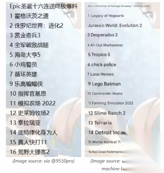 据外媒notebookcheck消息,近日,来自国内的消息源曝光了Epic连送活动的所有神秘游戏,传闻还将再送出14款游戏,按原售价计算总价值接近300美元(约2116元)。 截图显示:其它免费赠送游戏包括《侏罗纪世界:进化2》《赏金奇兵3》《海岛大亨5》《循环英雄》《小鸡警员》《乐高蝙蝠侠》《指挥官基恩》《泰拉瑞亚》《底特律变人》《真人快打11》《史莱姆牧场2》《模拟农场2022》《全面战争:战锤》《荒野大镖客救赎2》。