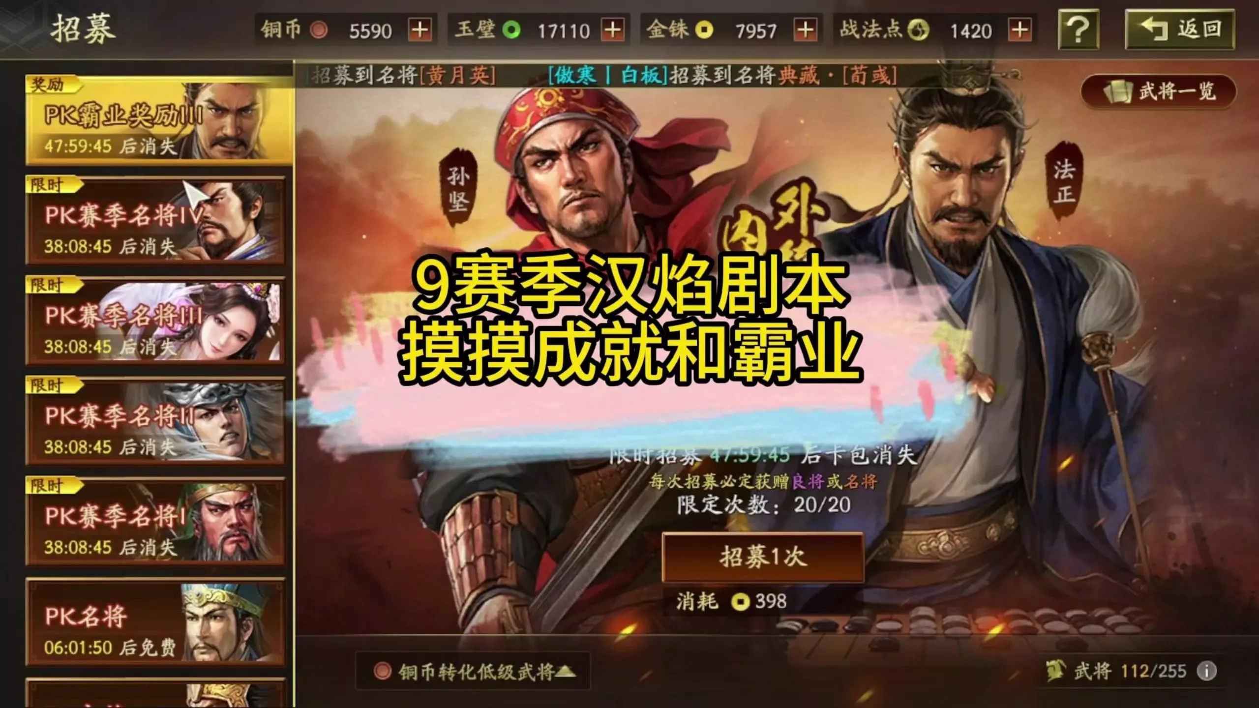这是《三国志战略版》S4赛季的0氪玩家内容,玩家将霸业和成就奖励的金铢直接用来20发梭哈限时招募卡包,没有使用玄学技巧,纯暴力抽卡,还展示了游戏内招募界面、赛季奖励领取等相关画面。