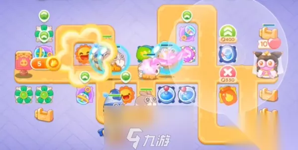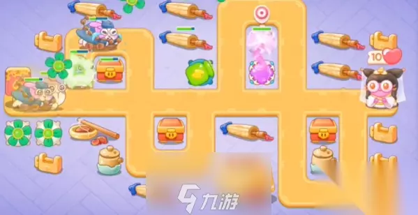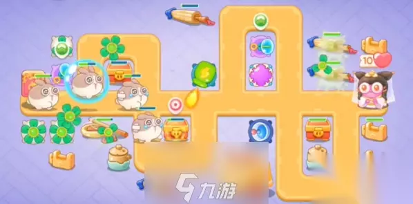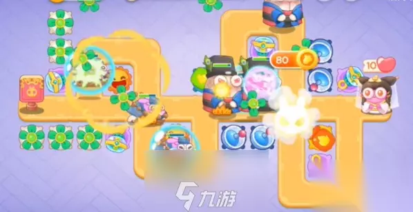 3、兔子出口附近增加一个泡泡塔,后面魔法塔瓶子炮清理周围障碍物。 4、第三波的时候,兔子出口增加一个风扇,中间位置增加一个雷达和泡泡塔。