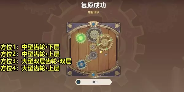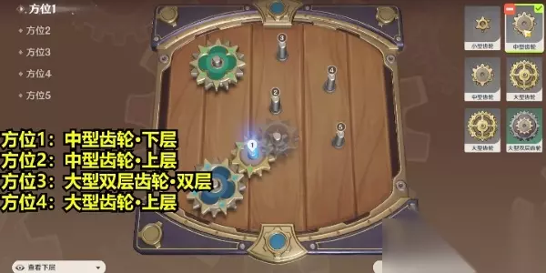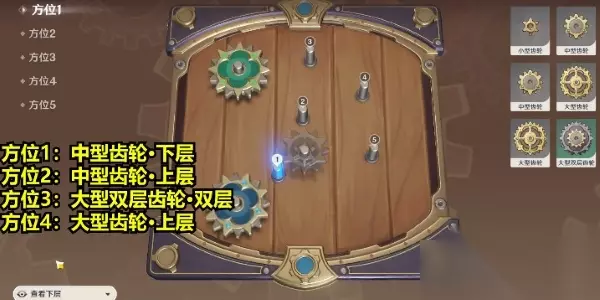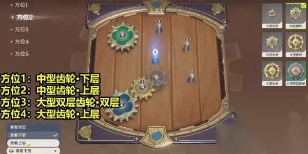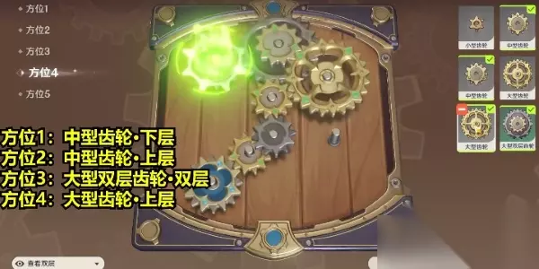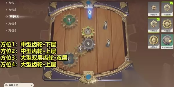 原神恒动械画第四关攻略 解析:复原【械画部件】之四中,对比之前的关卡,这一关我们需要调整的方位较少,首先是方位1我们选择查看下层中型齿轮,方位2上层中型齿轮,方位3双层大型双层齿轮,方位4上层大型齿轮。 1、复原【械画部件】之四