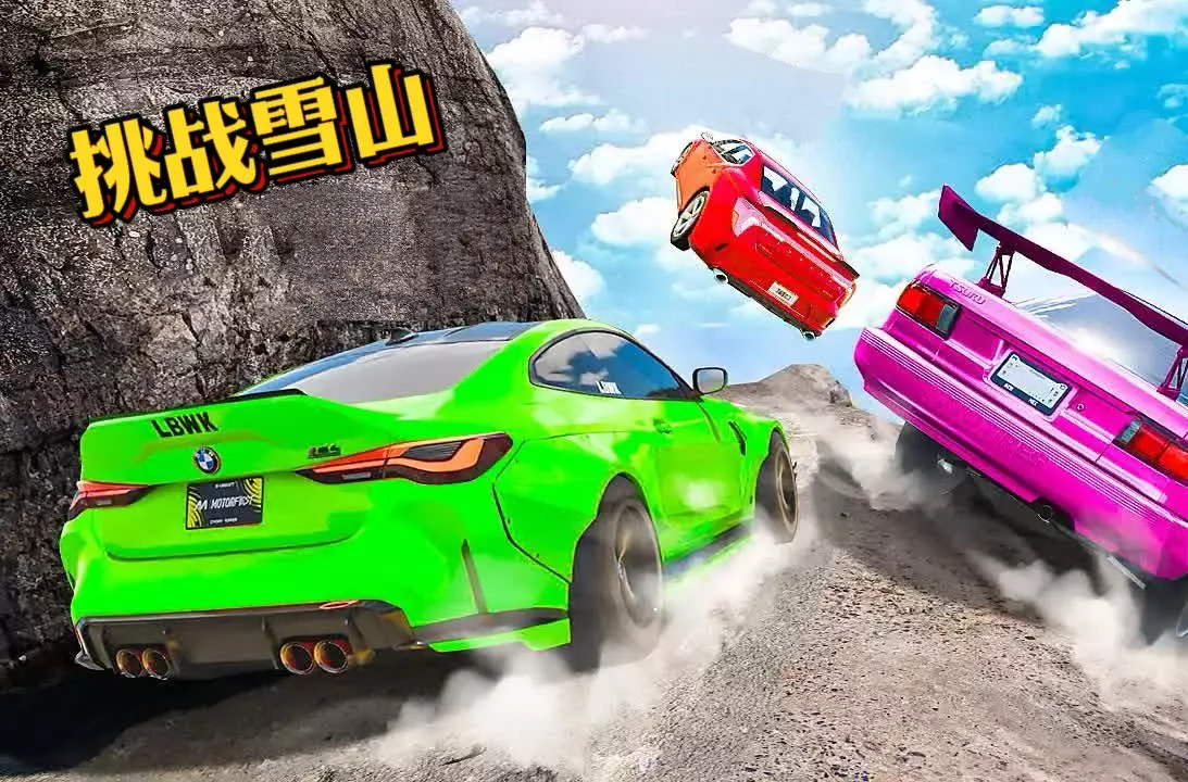 这是沙盒类的车祸模拟器游戏内容,展示了不同车辆在特殊赛道上行驶挑战的画面,还有特色怪物角色,发起谁能挑战成功的趣味提问。