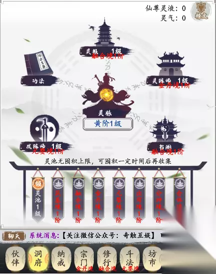 主角刚开始是蓝色的,这个时候战力比较低,要在洞府里面获取灵液,升级灵脉,主角的品质就会提升,品质由低到高的排序是:蓝->紫->橙->红->金,如果想加快灵液的获取速度,就升级灵池,灵池等级越高,获得灵液的速度就越快。