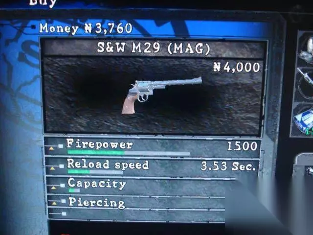 初始性能:火力:180装填速度:1.73sec.弹夹容量:8特殊升级:无游戏表现中规中矩,推荐一周目时从P8和P226中选择一把进行升级。大威力的麦林手枪是玩家猎杀BOSS级别敌人的首选,平时带在身边,可以猎杀突然出现的的电锯男,苍蝇怪等,让人安全感倍增。4.S&W M29获得地点:第3章第1部分,土着人的建筑底下的尸体旁边。美国S& W M29型左轮手枪 口径:11.2mm 全长:310mm 重量:1370g 弹容:6发