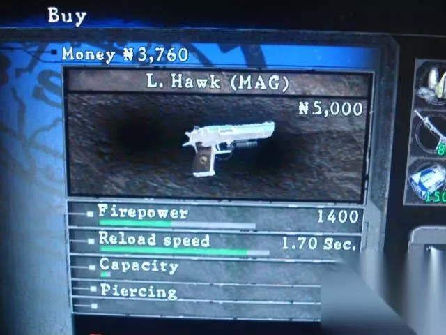 S&W M29的生产质量优良,表面处理华丽,主要有烤蓝和镀镍两种表面处理方式。枪的尺寸非常大,因为设计时考虑过把此枪用于狩猎的用途。而其他一些使用N底把设计的手枪看起来却显得较娇小。该枪的双动扳机扣力平滑,但要在这把大口径转轮手枪上用双动方式速射是不容易的。单发击发时扳机更轻,射击精度更容易高。在生产过程中,S&W M29的细节一直在进行调整和改进,例如改变坚固螺丝的数量和位置,或调整击发机构等,在1960年后每次工程变更都产生一个新的型号,首先是转轮旋转方向相反的M29-1。一年后取消了扳机护圈前的螺丝的型号称为M29-2,M29-2成为产量最多最常见的M29手枪,生产时间长达20年之久。在1982年曾短暂出现过取消枪管销和转轮凹陷的型号。由于多年来有许多射手抱怨M29太重了(扳机扣力),所以在1980年代期间S&W公司尝试解决这个问题,从1987年到1990年陆续推出的型号先后有M29-3、M29-3E、M29-4和M29-5。在1980年代后期有一种“经典”型(Classic)采用较重的全长式枪管下凸耳的帮助减少后坐感。在1994年推出的M29-6配有Hogue公司生产的橡胶握把,1998年推出的M29-7改进了击发机构。初始性能:火力:1500装填速度:3.53sec.弹夹容量:6特殊升级:Piercing游戏中第一把大威力的麦林手枪,屠杀初期的小BOSS级敌人不再话下,上弹时间慢是最大的缺点。5.L.HAWK(沙漠之鹰)获得地点:第5章第3部分BOSS战。2楼的棺材里,需要两人协力.IMI Desert Eagle 口径::0.50in(12.7mm)自动方式:导气式闭锁方式:枪管回转式供弹方式:弹匣容弹量:7发全枪长:270mm 枪管长:152mm全枪质量:1.99kg准星:片状