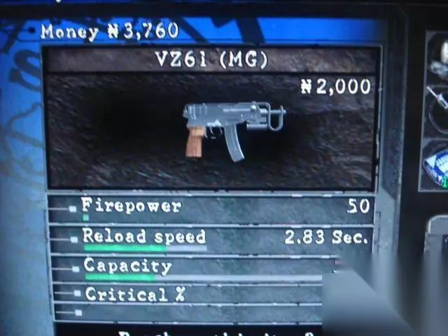 初始性能:火力:50 装填速度:2.83sec.弹夹容量:50特殊升级:Critical% 早期获得的冲锋系武器,用起来效果还不错,交给西瓦让她去点射吧。 2.MP5 取得地点:第2章第1部分,开始的吉普车旁的箱子内。 德国MP5微型冲锋枪 原产地:德国 制造商:赫尔勒·科赫(HK)公司 口径:9mmParabellum巴拉贝鲁姆 容弹量:30发 有效射程:200m 空枪重量:3.42kg 初速度:1312英尺/秒 枪口动能:637焦耳 射速:10.94发/秒