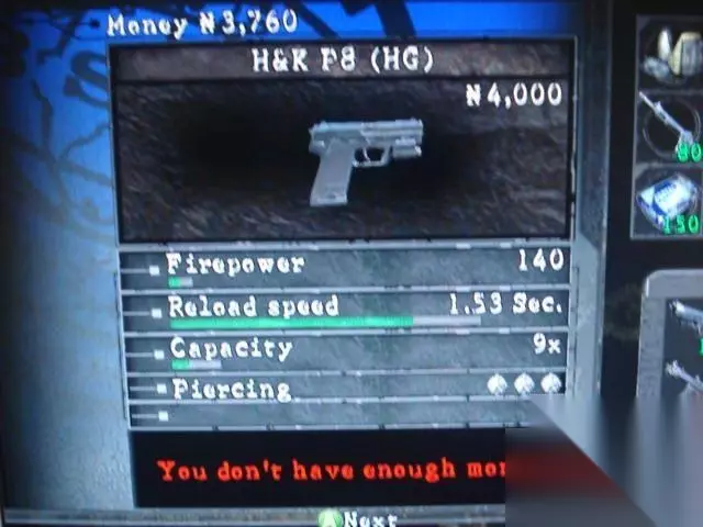 初始性能:火力:150装填速度:1.70 sec.弹夹容量:10特殊升级:Criticla%作为游戏初期的武器,M92F的性能还是非常不错的,升级后弹夹容量也非常可观,是游戏前期的基本装备。2.H&K P8获得地点:第2章第3部分结束后购买。H&K USP 德国陆军编号P8 口径 -.40S&W 9mmx19 全长 - 194mm 全重 - 830g/770g 弹夹容量 - 13/15