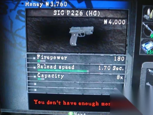 着名的MP5不会没人知道吧,获得时间早,性能也不错,用起来有种打CS的感觉-_- 初始性能:火力:140装填速度:1.53sec.弹夹容量:9特殊升级:PiercingP8的表现在游戏中还是非常不错的,稳定的攻击火力,大容量的弹夹,最重要的是帅气的外形,让笔者爱不释手。3.P226手枪获得地点:第4章第2部分结束后购买。SIG Sauer P226 全枪高:139 mm 全枪宽:37 mm 枪管长:112 mm 瞄准基线长:160 mm 空枪重:865 g 弹匣容量:15发
