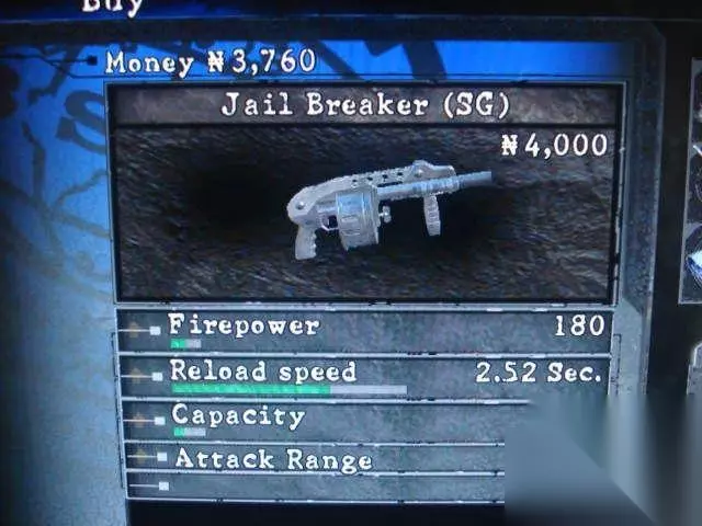 初始性能:火力:300 装填速度:3.00sec.弹夹容量:5特殊升级:无 游戏中最为主力的武器,火力升满后的攻击利非常可观,无论是解决成批的杂兵,还是对付单个强力怪物,它都能够胜任。 3.jail breaker 取得地点:第6章第1部分,船舱底部。 striker