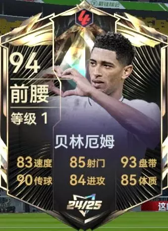 赛季之星贝林厄姆:94的总评,前腰主注册位,数据看出也是非常顶尖的一个前腰球员。对比以往欧战的贝林来说数据方面也是相差不多,但是唯一在技能方面,欧战贝林有重炮轰门的技能特性,对于这个版本竞技方面还是挺偏向于重炮技能,所以更有性价比的贝林还是欧战之星的贝林,不过最好的贝林还得是欧洲杯95贝林。当然这些中拥有其中一个也算是顶尖毕业的球员了。仅个人观点,因人而异。