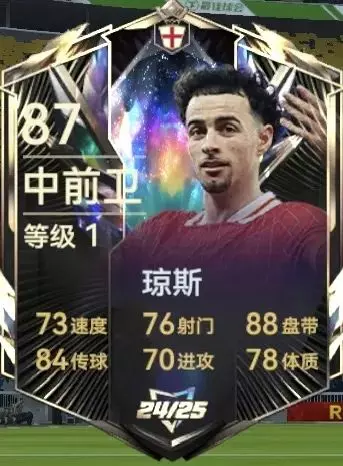 赛季之星琼斯:总评87的平民卡,后腰注册位的球员单从数据方面看出球员一般,但是模型185cm的身高加上给了一手铁人的技能,可以在英格兰队套首发位置上有一席之地,当然个人建议还是替补出战为好,平民队套毕业。