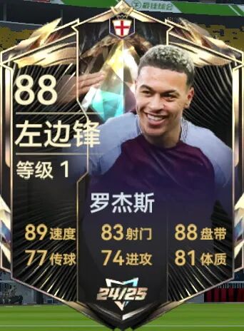 赛季之星罗杰斯:88总评的左边锋的主注册位,数据看出在边锋位置是中规中矩。对比此前欧战的89罗杰斯数据方面差不多,一个是左边锋搭配疾速盘带技能,另一个是前腰位置搭配快速弧线球技能,总体来说两个都可以过渡使用,个人建议替补出战。