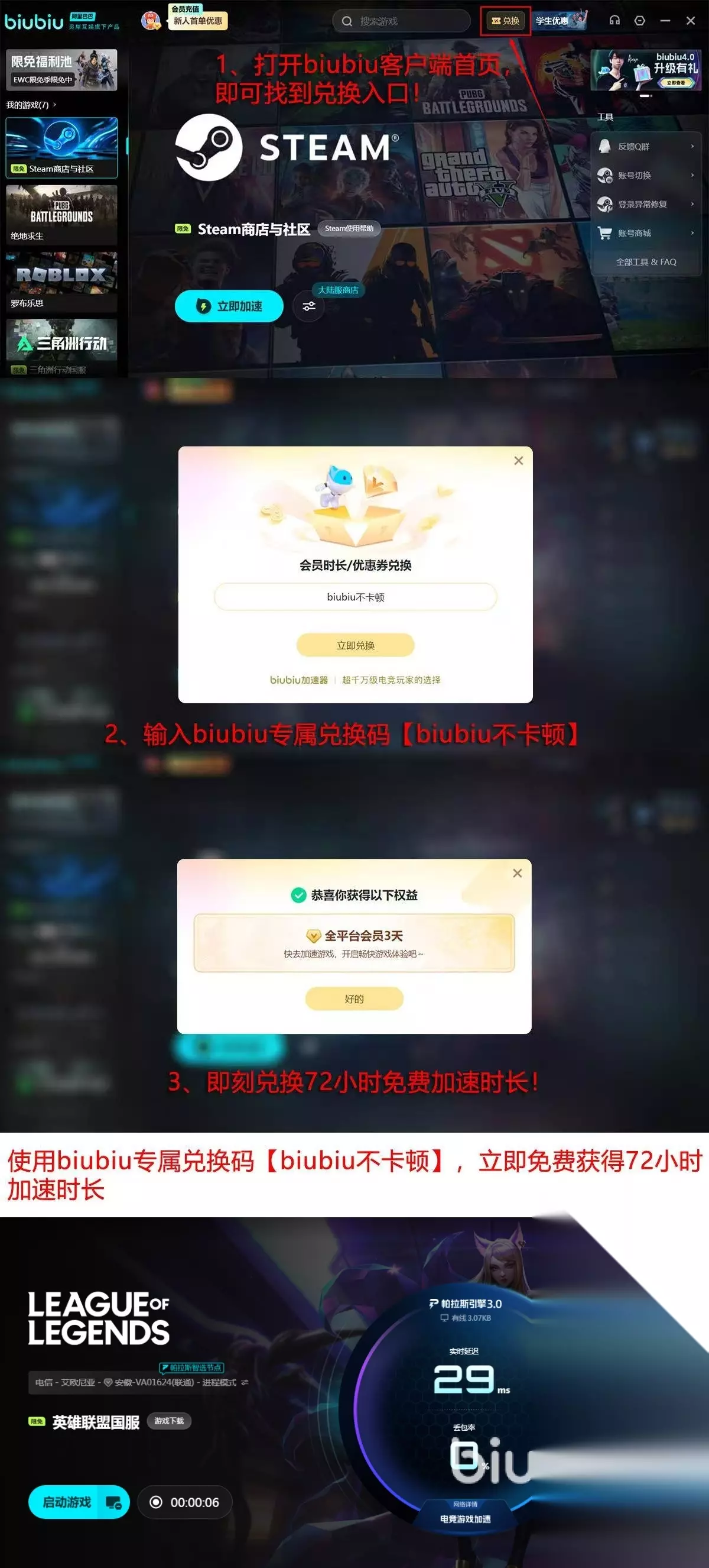 同样的,该产品也是考虑到广大用户的使用福利,新老用户均能享受,如果是初次成功注册,就能立刻拥有24小时免费加速机会,不需要领取,系统直接发放的,即便是老用户,也可以和新人一起输入“biubiu不卡顿”这个实用口令参与福利,额外拿到72小时,累积起来就长达4天,且平台上的大多数游戏,基本都能加速。