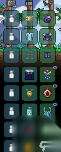 2.开始冒险 撸树,挖石头,探索地表。按esc键即可打开背包,在左下角为制作栏,右下角从左往右依此为染色栏,装扮配饰栏(装备不起作用),装备配饰栏(起作用)。只需关注最后一列即可,前三行为装备栏,后5行为饰品,大师难度可多装备一个饰品。h键位快速喝药