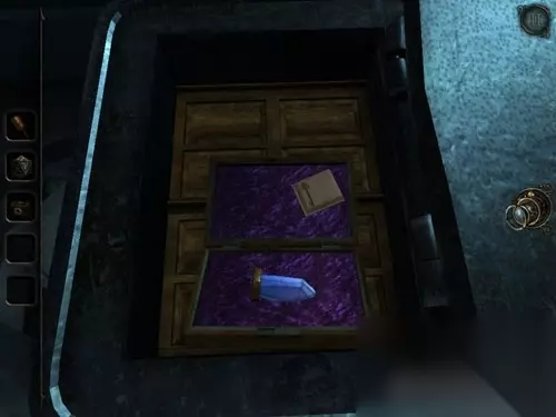 此时你可以看到一个蓝色水晶以及与五棱角魔盒里相似的机关,同理,让六个小机关的光线照在水晶上,放映机就会启动,出口由火车 3 号厢门换成黑暗木门。