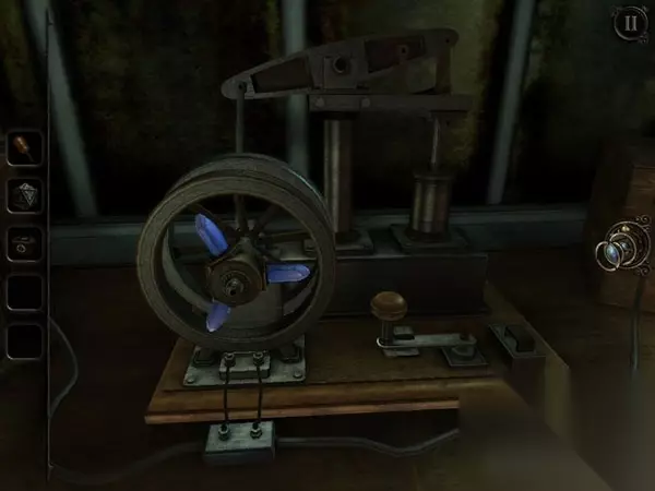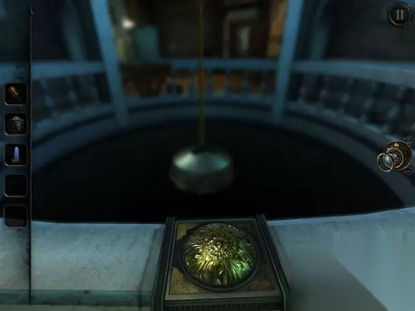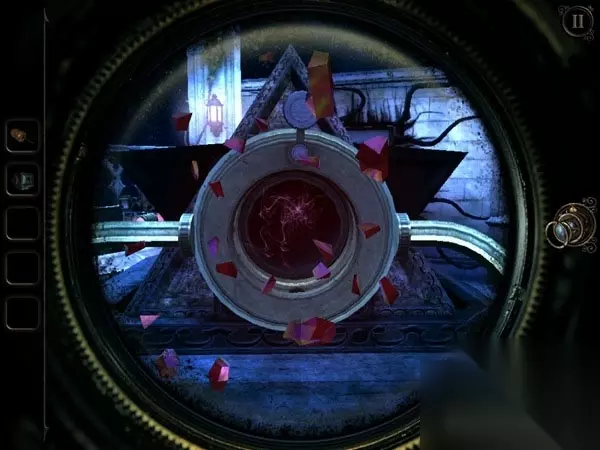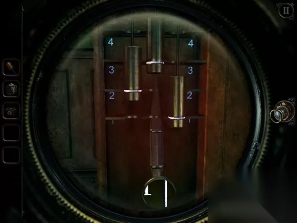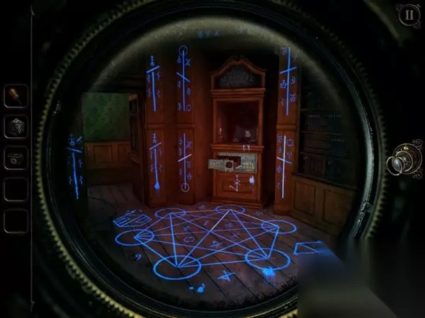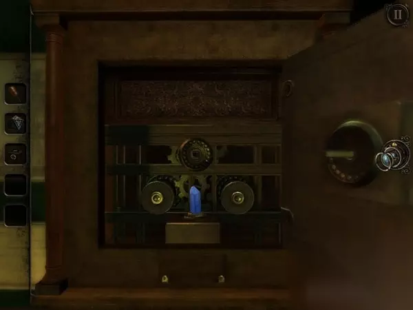 这两个缺失的水晶分别藏在大钟里和保险箱里。大钟在书房的门后,正对着书桌。肉眼看上去,并没有什么特别之处,但如果用透视镜看,效果又会大不一样。你会看到大钟摇摆的地方出现三个数字:4、1、2,刚好对应了上面的三条转轴。将转轴的放光条放至数字相对应的位置上,大钟的暗格就会打开,这样你就可以获得第二个水晶。 Part 2 而另一个水晶,则要坐电梯到二楼处,找到那个保险箱。不过,保险箱因为太老旧了所以从正面开是行不通的,只能采取一些更强硬的方法。穿过走廊,到达保险箱的对面,你会发现护栏上有一个金色的机关,不妨按住它向不同方向移动,此时你会发现前方悬吊的大铁锤也跟着摇摆。看来金色机关确实可以控制大铁锤。