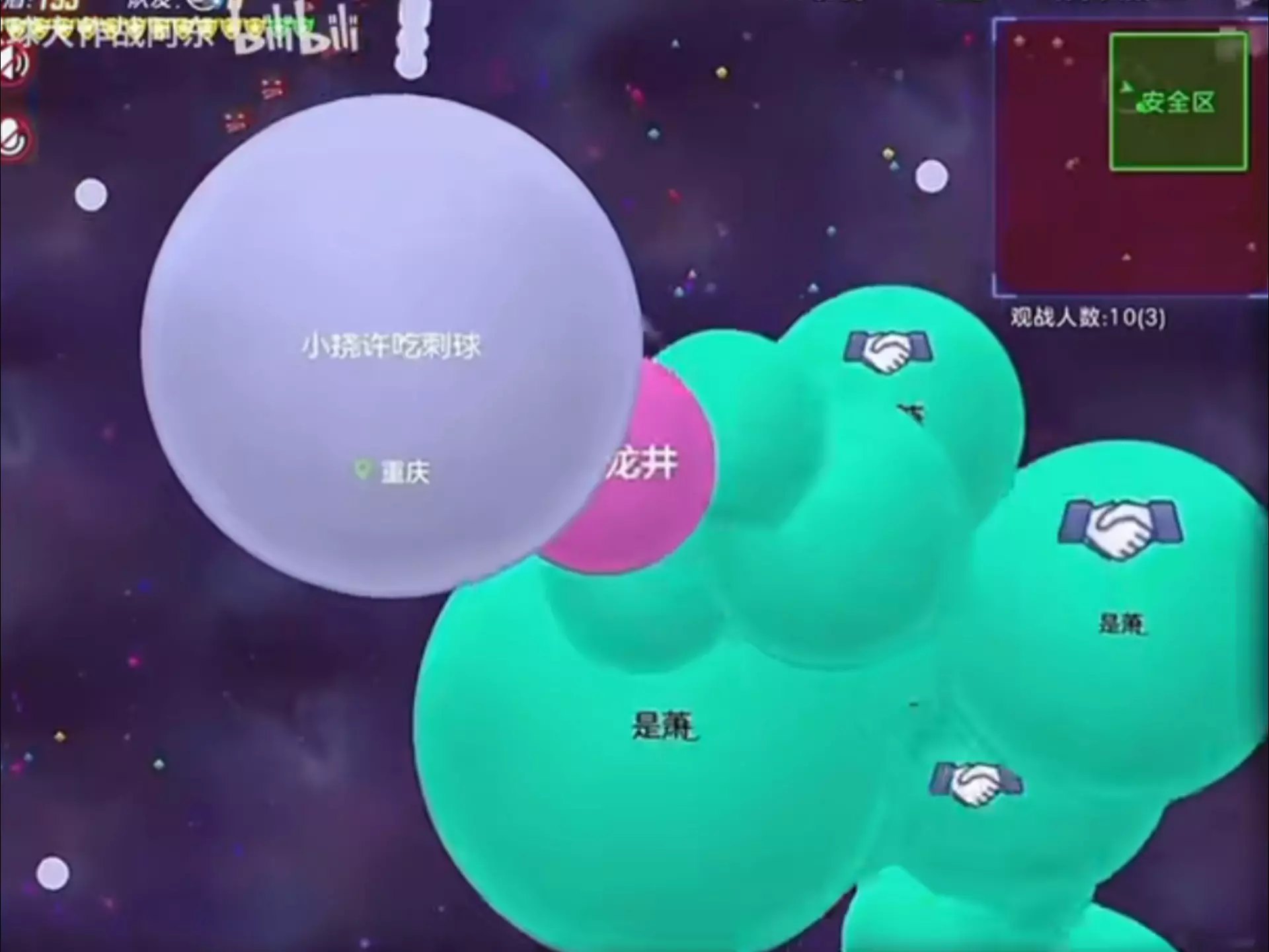 这是《球球大作战》的游戏对局内容,展示了玩家在纯绿零球锁玩法里的对战过程,画面呈现了游戏中的安全区变化、玩家的球体操作,以及对局里剩余人数、防护盾等游戏数据,玩家在对局中逐步推进,应对危险区域扩散等游戏机制。