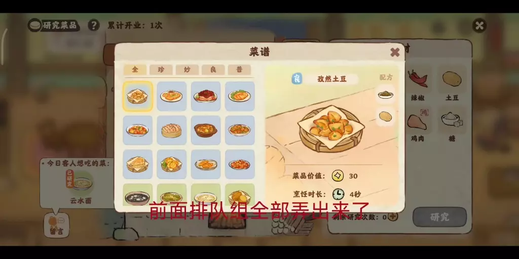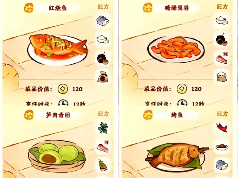 桃源深处有人家食来运转妙品菜谱配方大全 一、良·菜谱 1、辣椒炒鸡蛋=辣椒+鸡蛋 2、酥脆麻=面粉+糖 3、牛肉蒸蛋=牛肉+鸡蛋 4、土豆煎饼=土豆+面粉 5、番茄炒鸡蛋=番茄+鸡蛋 6、香辣鱼块=鱼肉+辣椒 7、水煮牛肉丸=牛肉+面粉 8、青椒擂皮蛋=皮蛋+辣椒 9、孜然土豆=孜然+土豆 10、卤牛肉=牛肉+香料 11、鬼火绿=辣椒+咸鸭蛋 12、鸡蛋饼=鸡蛋+面粉 13、烤牛肉床=串=牛肉孜然 二、普·菜谱 1、云水面=面粉 2、虎皮辣椒=辣椒 3、碳烤土豆=土豆 4、清蒸鱼=鱼肉 5、鸡蛋羹=鸡蛋 三、妙·菜普 1、咸蛋黄焗土豆=土豆+面粉+咸鸭蛋 2、糖醋荷包蛋=醋+糖+鸡蛋 3、炒牛柳=糖+牛肉+辣椒 4、香菜鸡蛋饼=香菜+面粉+鸡蛋 5、番茄鱼=番茄+鱼肉+香料 6、牛肉面=牛肉+面粉+香料 7、香菜炒牛肉=牛肉+糖+香料 8、香菜炒牛肉=牛肉+辣椒+香菜 9、咸蛋黄饼=咸鸭蛋+面粉+糖 10、酸辣土豆丝=土豆+辣椒+醋 11、凉拌香菜=香菜+醋+辣椒 12、土豆炖牛肉=土豆+牛肉+香料 13、凉拌皮蛋=辣椒+醋+皮蛋 14、番茄鸡蛋面=鸡蛋+面粉+番茄 四、活动时间 2024年6月18日10:00-2024年6月22日23:59 以上就是小编为大家带来的桃源深处有人家食来运转妙品菜谱配方大全,小伙伴们抓紧制作美味的食物吧,更多游戏攻略就在233乐园。