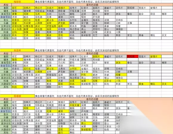 聊天话题选择 这个适合的是挑战模式,选纯体力人物可以参照,因为这个任务刷智力等级不好刷,至于其他的就感觉一般不太需求,因为智力等级上去了,是可以一键点满这个好感度话题。 朱晨曦 爱情片 喜剧片 刷视频 爵士乐 乡村乐 小提琴 流行乐 烹饪 西餐 美食 农家乐 湘菜 粤菜 浙菜 川菜 闽菜 瑜伽 健身操 按摩 游泳 时尚 星座 科技 模玩 剪纸 露营 钓鱼 杨欣悦 古筝 爱情片 农家乐 烹饪 滑雪 温泉 旅游 健身操 蹦迪 瑜伽 科技 高珊珊 古装片 爱情片 古典乐 古筝 深蹲 跳水 有氧跑 平板支撑 网球 派对 海边休闲 桌球 蹦迪 拼图 剪纸 民宿 滑雪 花滑 桑拿 度假村 温泉 时尚 李子娟 纪录片 奇幻片 悬疑片 恐怖片 美食 苏菜 粤菜 浙菜 逛街 登山 钓鱼 竞走 游戏 水上乐园 平板支撑 健身操 仰卧起坐 花滑 萨克斯 乡村乐 白嘉卉 西餐 游戏 时尚 吉他 桌游 度假村 民宿 温泉 桑拿 网球 滑雪 瑜伽 刷视频 古装片 爱情片 古典乐 纯音乐 萨克斯 演唱会 唢呐 寻小仙 桑拿 登山 露营 旅游 温泉 湘菜 烹饪 瑜伽 有氧跑 滑雪 蹦迪 演唱会 小提琴 手风琴 吉他 喜剧片 刷视频 古装片 悬疑片 科技 星座