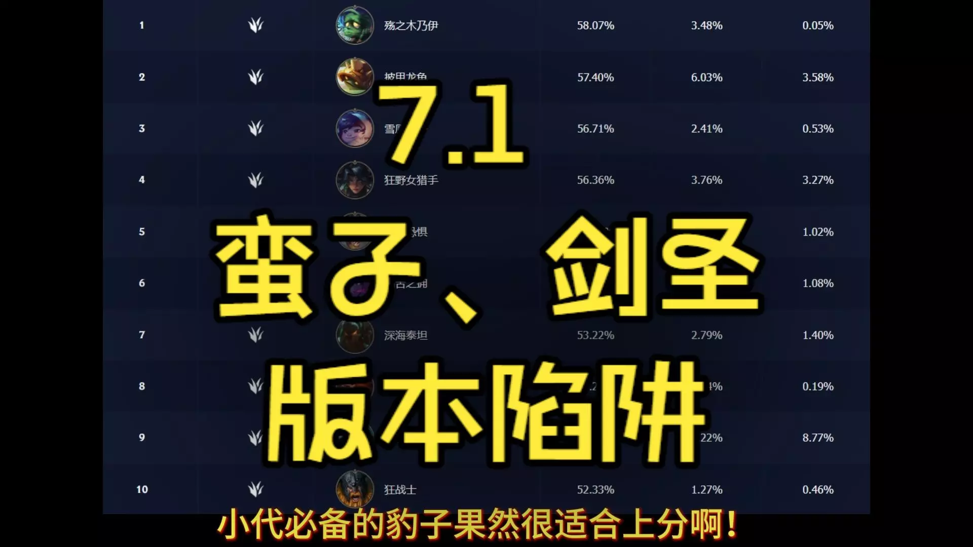 本文带来英雄联盟手游7.1版本大浪淘沙后稳定的上单数据排行,为玩家推荐不同梯度的强势上单英雄,展示了钻石分段胜率前十的上单数据,方便玩家参考选择上单英雄冲分。