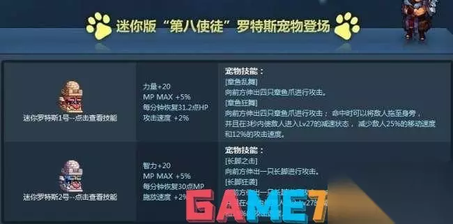5、做宠物 曾经DNF宠物DIY有两种型号,分别是迷你罗特斯1号、迷你罗特斯2号。在制作宠物之前,玩家肯定要先获取到相应的设计图 步骤1:先要有一张宠物设计图,这个很简单,在奥兰奶奶处有出售宠物设计图。 步骤2:按照设计图的要求,收集相应数量的[生命之泉]和[生命力碎片] [生命之泉]可以通过完成奥兰奶奶的每日任务获得,还可以去商城直接购买对应的袖珍袋,打开之后至少能获得2个[生命之泉] [生命力碎片]可以通过刷天界及素喃地区领主来获得 步骤3:完成以上所有步骤,收集好设计图和所需的材料,就可以通过使用设计图来制作属于自己的DIY宠物了。