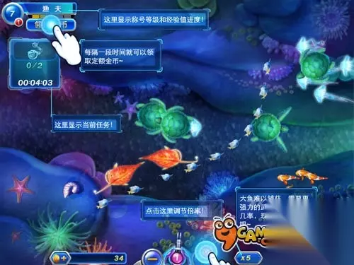 UI界面需熟悉 首先无论是新老捕鱼玩家,熟悉游戏UI都是十分重要的。左上方的经验值进度条,可以让你紧紧把握捕鱼升级的 节奏,随着升级不断有新场景、新倍率、新武器、新称号解锁,更有大量金币作为奖励。升级是最稳妥的打金手段。此外,左上方的领取金币按钮,会定时发放“工资”,连续领取五次工资后,更会获得幸运转盘的抽奖机会,RP爆棚就能获得意想不到的金币回报。