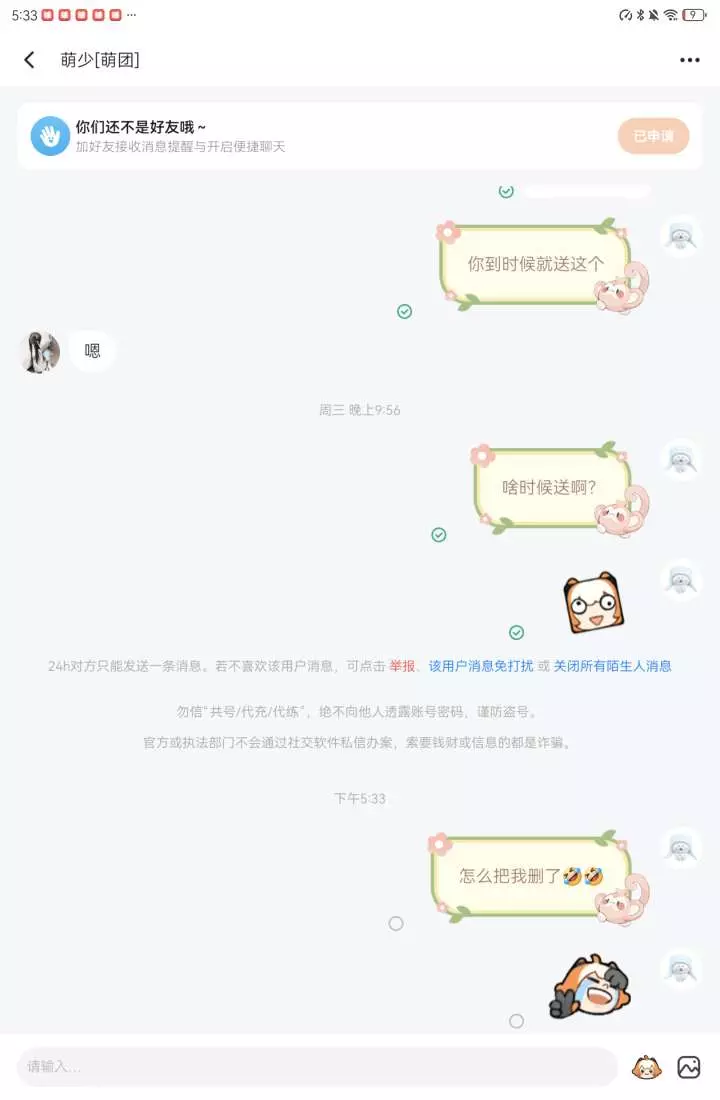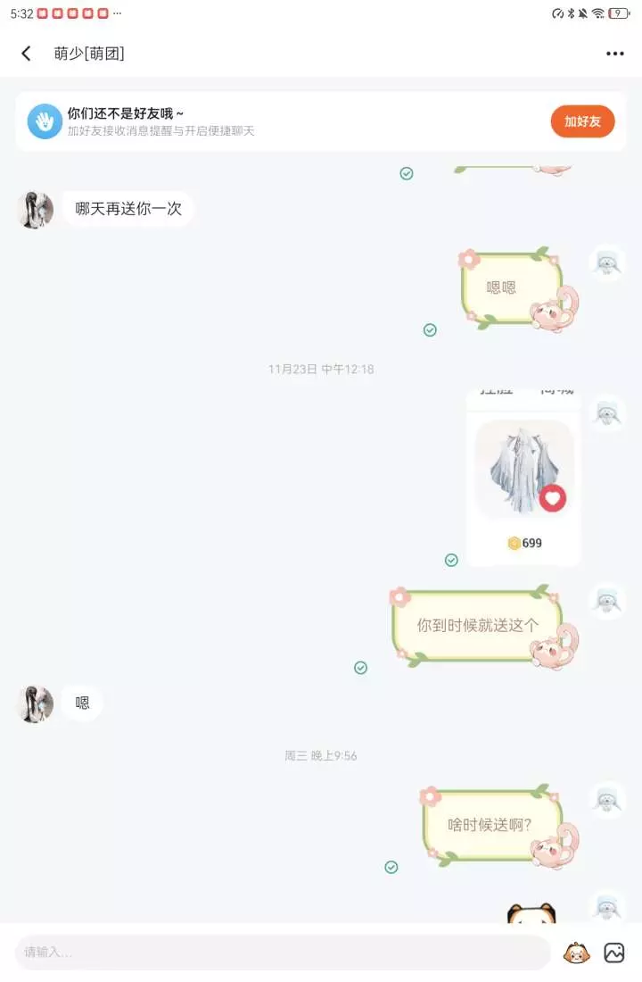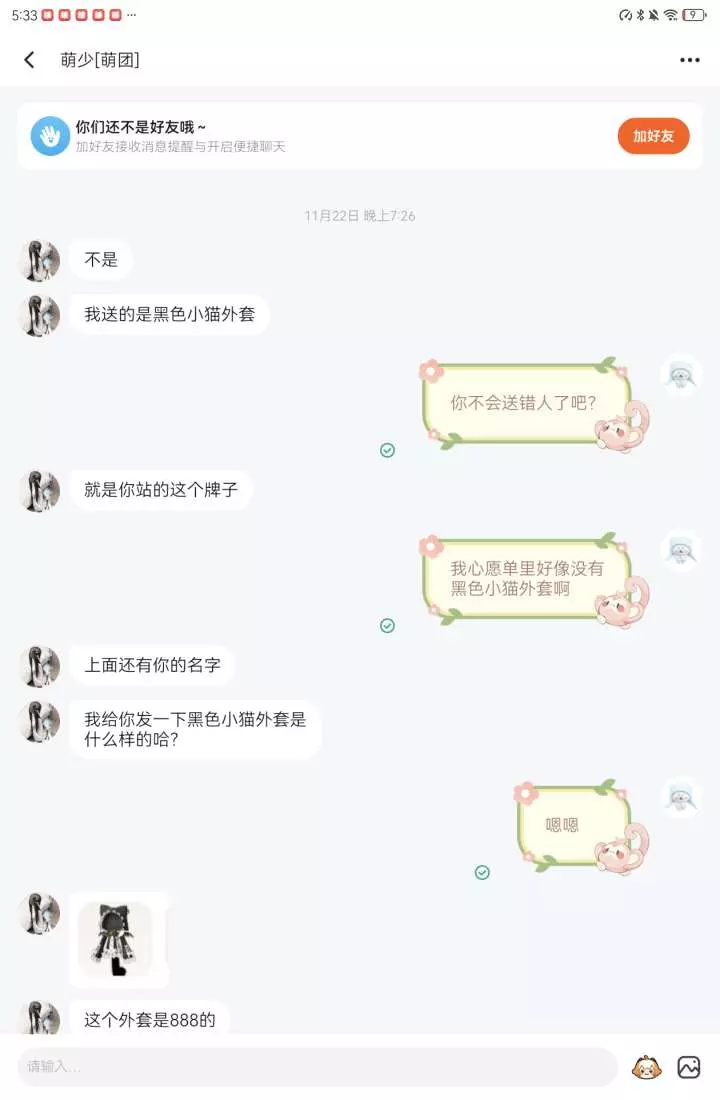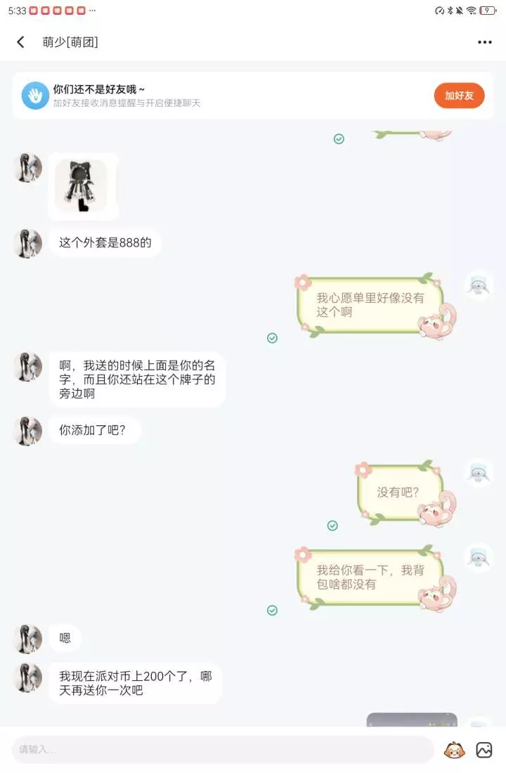 之前找他互送699的,我送完他后,他说他送我一个888的小黑猫外套。但是我心愿单根本没有这个。而且好像也不是888的吧??????自己看一下自己阴不阴。。。怎么?浮木飞了吗?还是死了?😂😂😂😂我还存着之前送的证据,怎么还把我删了,自己做的事自己也知道啊?