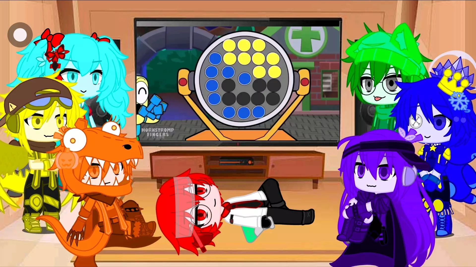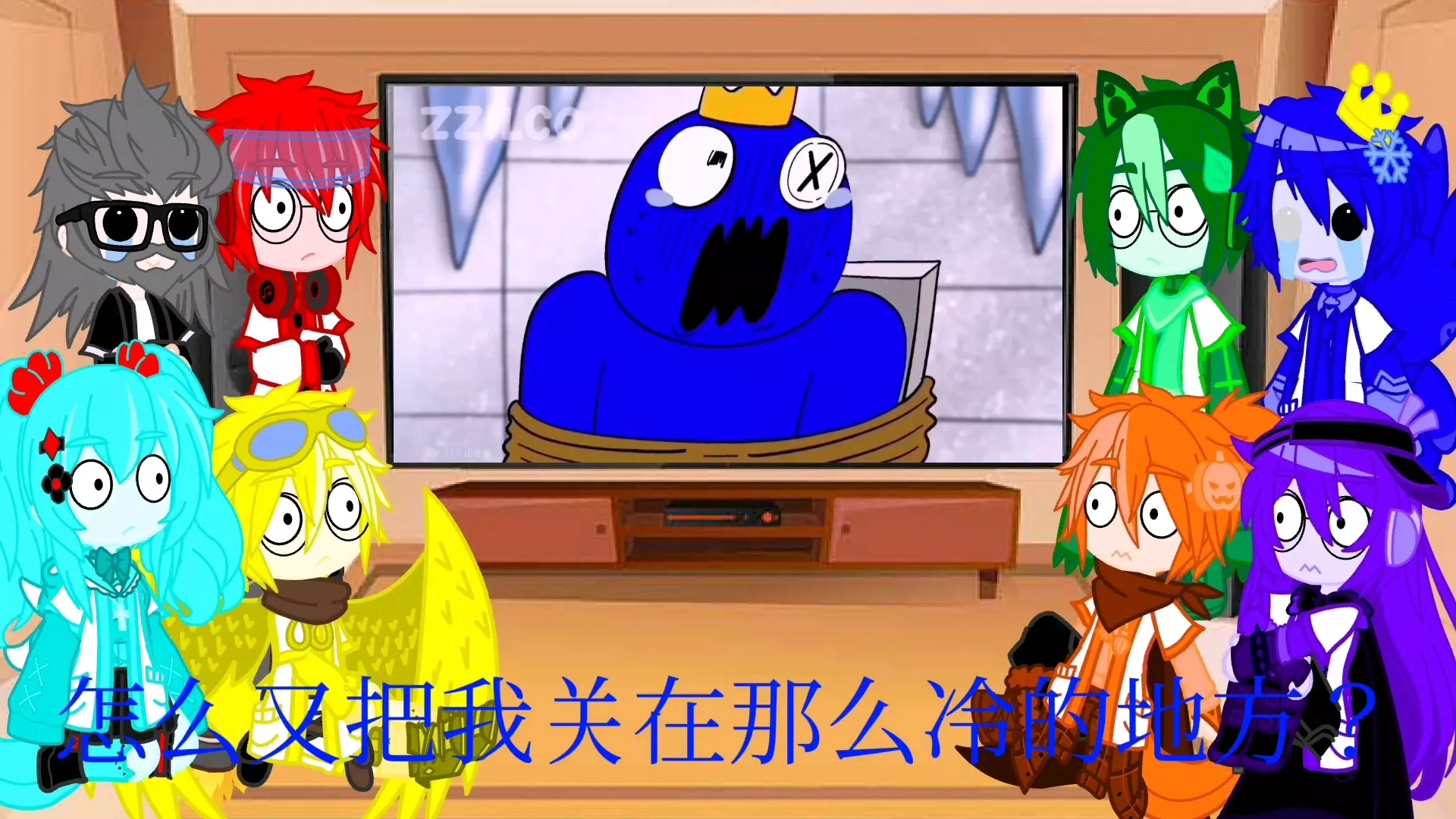 这是《FPS 加查俱乐部彩虹朋友反应视频(60)》,视频里加查俱乐部的角色们观看相关内容,屏幕呈现带有暗黑风格的画面与相关文案,展现出角色们的反应,属于彩虹朋友相关的趣味反应类内容。