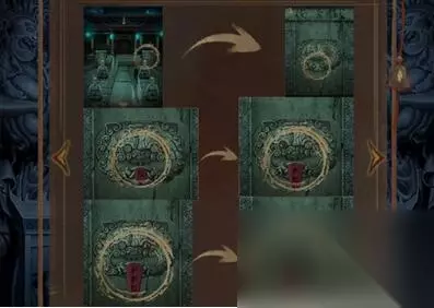 2、继续点击旁边场景左边的石墙,将下面的火焰图案翻转,观察上面五口油锅的位置和浮现的字。