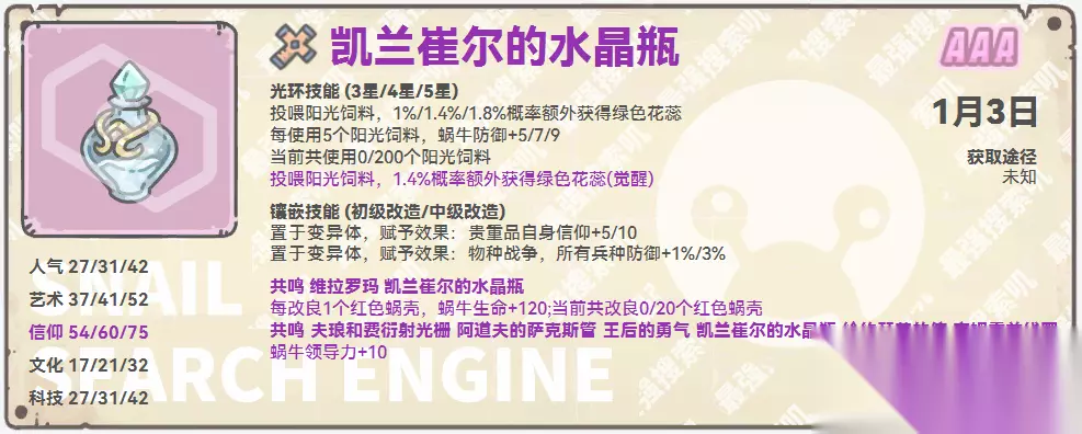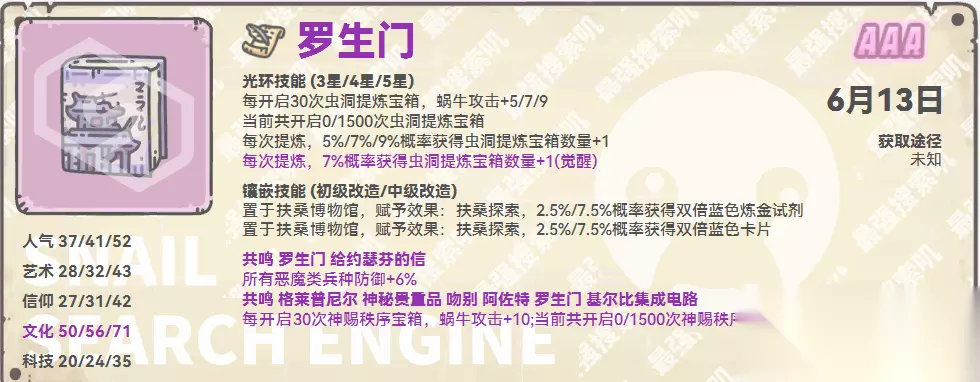 食人花胃囊空间 1. 亲和度达到500时,地缝商店将刷新道具“内窥镜”。内窥镜售价200古代币,用于解锁食人花胃囊空间。 2. 挑战食人花胃囊空间的怪物,可获得各类资源及亲和度奖励。最主要的奖励是3个紫贵,保守估计35万攻击左右能全部拿完。 3. 胃囊空间目前共有13层,合计64个敌人。 新增紫色贵重属性展示