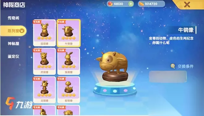 2、陈列室 通过陈列室可以兑换各种铜像家具,比如十二生肖系列、摩汉系列。想要兑换这些铜像家具的话,小伙伴们需要收集特定材料才可以进行兑换,而这些特定材料通过日常采集有一定几率可以获得。