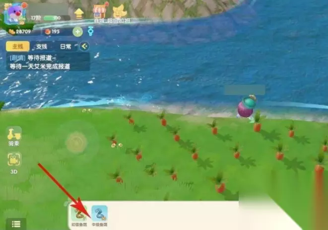 2、到达浆果丛林池塘钓鱼点,鱼饵选择中级鱼饵级别以上。