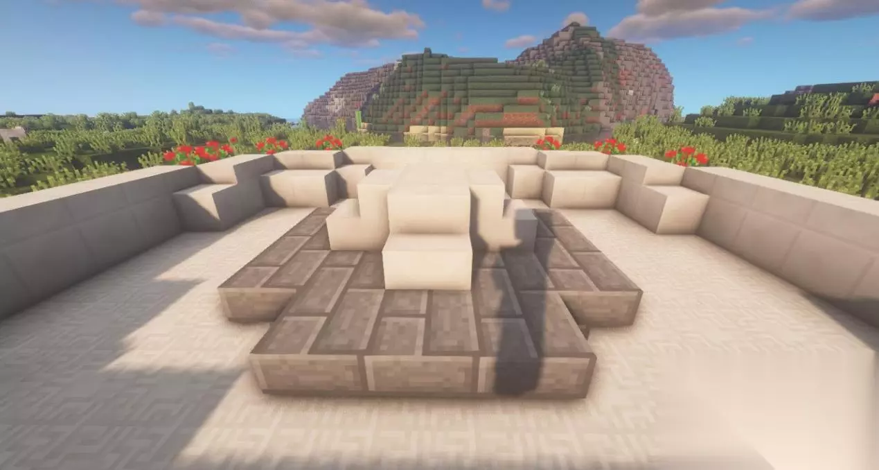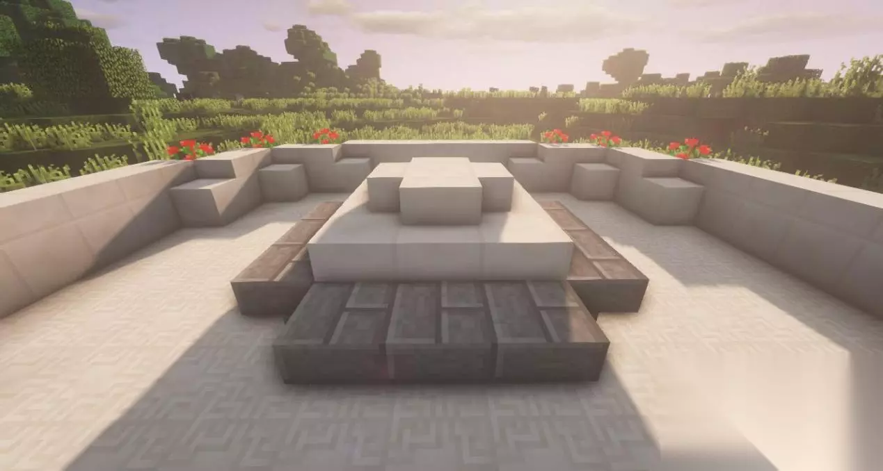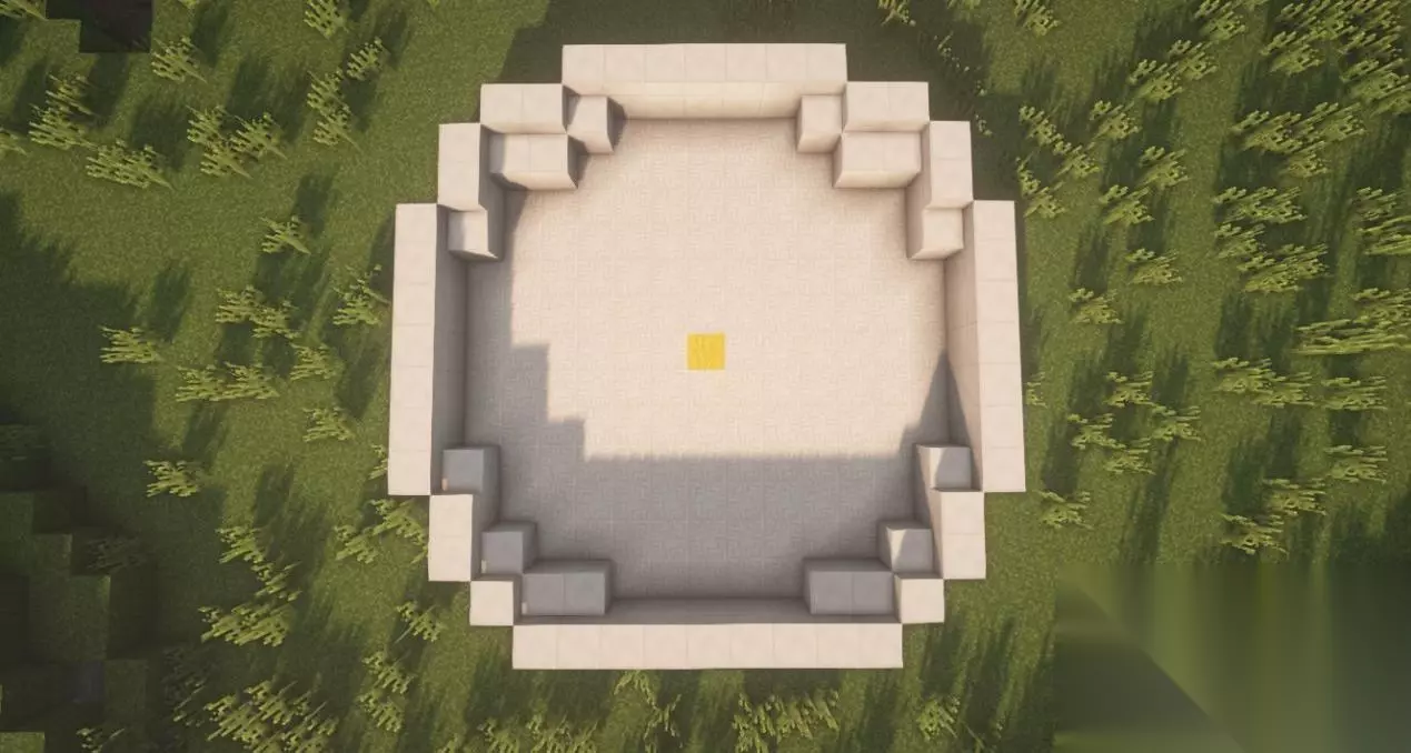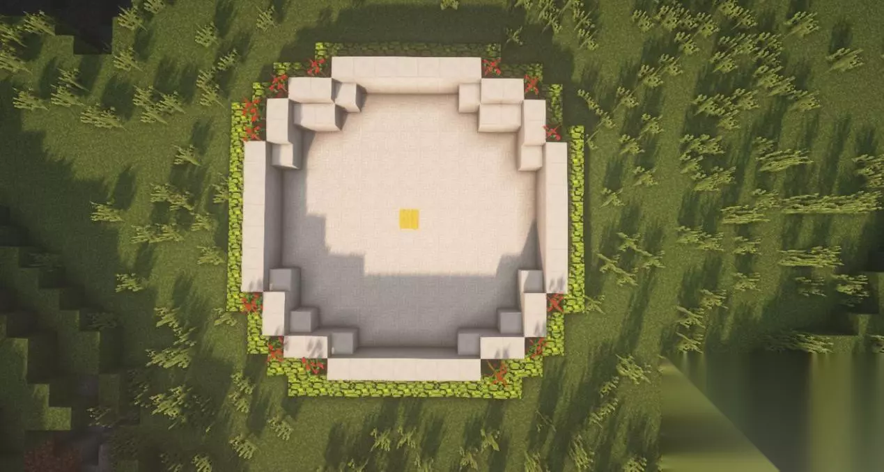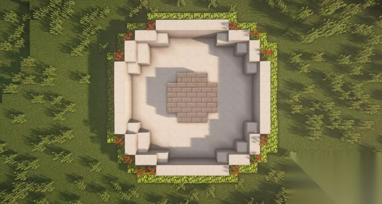 二、中央喷泉 在圆中心放置3*3的石砖后,在正方形的四周分别放3个石砖楼梯。