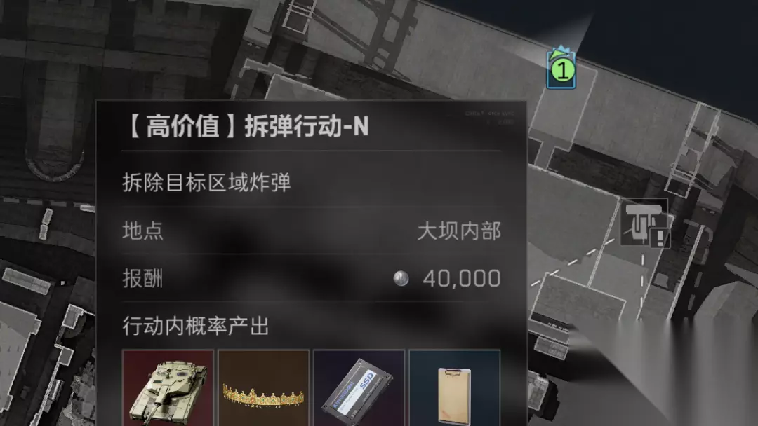 - 拆弹行动-N:接取点位于大坝北部的地下金库内,从行政辖区绳降后直线进发效率最高。
