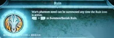 战马RUIN 当马头图标显示的时候,WAR可以随时召唤出他的幽灵坐骑。 使用LB+RB来召唤或者驱逐RUIN.