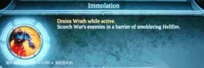 献祭 启动时持续耗费怒气 使WAR的敌人在地狱的怒火中被烧成灰烬 升级:使火焰的持续伤害更加显著